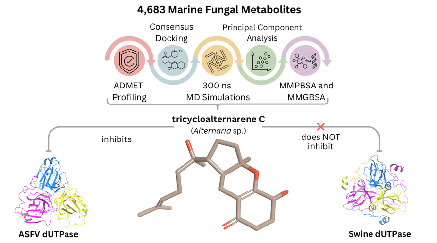 Molecular docking was performed to explore the binding affinity of the 12 selected molecules in the target enzyme and then evaluated for in silico ADMET properties. The best hits were subjected to molecular dynamics simulation.